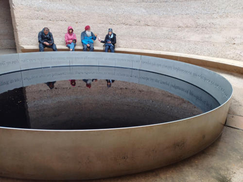 signed, words reflecting in the water.